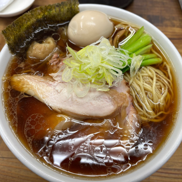 高円寺に本店がある人気店。あっさりとした臭みのない豚骨スープ。表面には真っ黒な鰹の香味油がのる。煮干、焼アゴ、昆布などのうまみとあわさり、複雑で香り豊かなスープ。自家製麺。